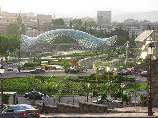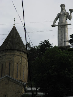 a "Mother of Georgia" szobor is, igen nagy nőalak (szinte mint nálunk a „Tolltartó”) egyik kezében karddal, másikban valszeg' valami boros-edénnyel - aki barátként jön, azt utóbbival, aki ellenségként, azt karddal fogadja... nade szóval nem messze onnan lent van a Freedom Tér, ami felett kicsivel van a hotel, ami igen központi az óvárosban, de az utcák nagyon durva állapotban vannak, feltúrás, vagy csak úgy (későbbi kiegészítés: azóta láttam, hogy leginkább a járdák vannak rossz állapotban sokfele, az utcák csak némelyik negyedben; ja és van pár rész, ami meg teljesen fel lett újítva az utóbbi években) -- a házak körbe gyönyörűek, sok sok helyen van kilógó fa-alapú balkon, akár hosszú sor, faragásos, többnyire beépítetten - -csodaszépek.... …persze közben szinte mindegyik kopott is;